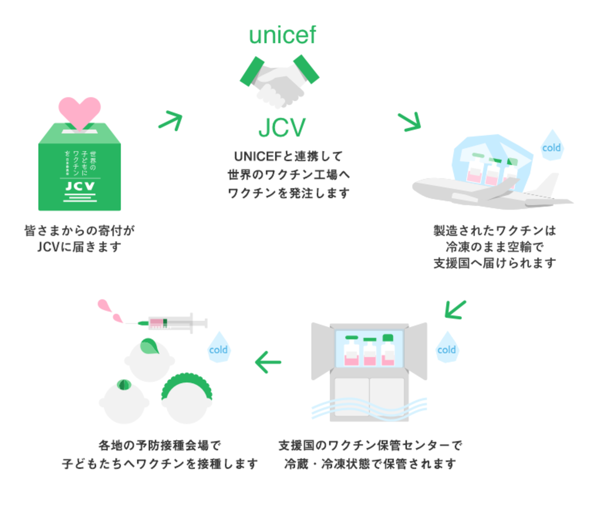 JCVは、ちいさな命を1人でも多く助けるため、子どもワクチン支援を続けていきます。これからも、募金、タイアップ協力、ペットボトルキャップやハガキ・切手の回収、SNSキャンペーンへのご参加など、無理のない範囲で活動にご協力いただけると嬉しいです。これからも、よろしくお願いいたします。