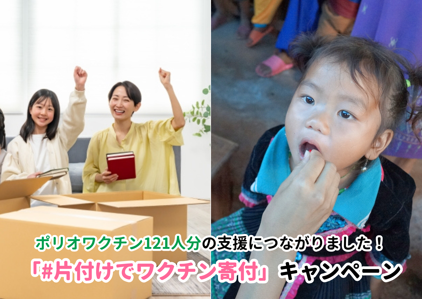 JCVは、支援企業である株式会社ブックオフコーポレーション様の協力の下、「#片付けでワクチン寄付」キャンペーンを12月1日~31日まで開催いたしました。お片付けに関する写真や動画に「#片付けでワクチン寄付」と付けて投稿すると、1投稿毎にポリオワクチン1人分がブックオフからJCVに寄付されるこのキャンペーンについて、集計が完了。途上国の子どもたちのため、合計121件の投稿が集まりました。