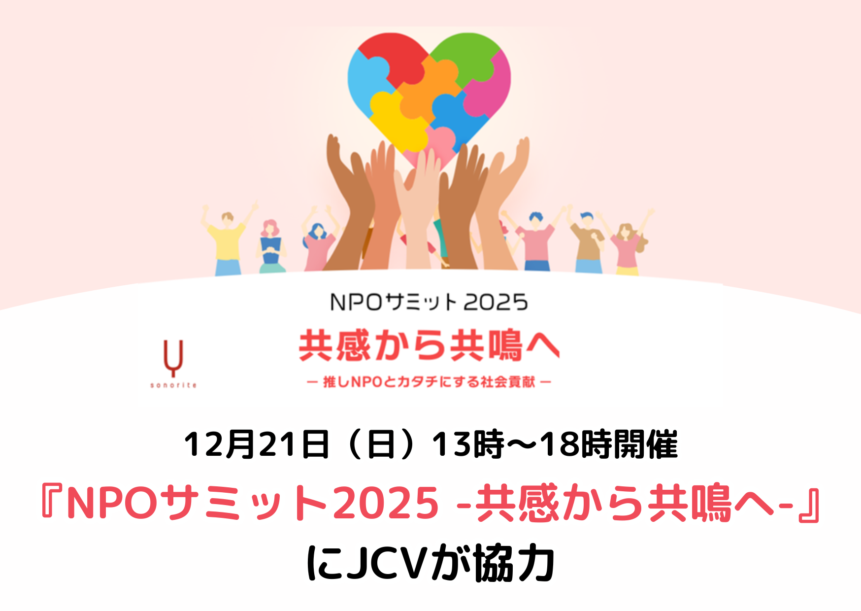JCVは、株式会社ソノリテが、2025年12月21日(日)13時から、サイボウズ株式会社東京オフィスにて開催するチャリティイベント『NPOサミット2025 -共感から共鳴へ- 〜推しNPOとカタチにする社会貢献〜』に協力します。当日はJCVも会場にブースを出展。さらに、スペシャルサポーターの和田毅さんが基調講演を行います。