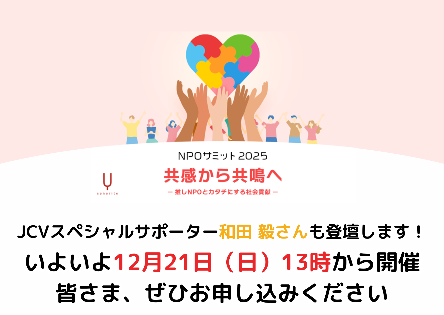 JCVが協力するチャリティイベント『NPOサミット2025 -共感から共鳴へ- 〜推しNPOとカタチにする社会貢献〜』が、いよいよ2025年12月21日(日)13時からサイボウズ株式会社東京オフィスにて開催されます(主催:株式会社ソノリテ)。皆さま、お申し込みはお済みでしょうか。