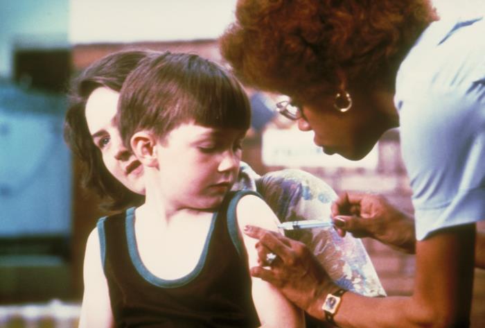 左:はしかのワクチン接種の様子。基礎的なワクチンとして、昔から世界各国で接種が行われている。