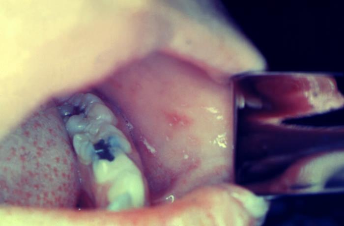右:口内にできた白いできもの(コプリック斑)。はしか特有の症状の1つ。