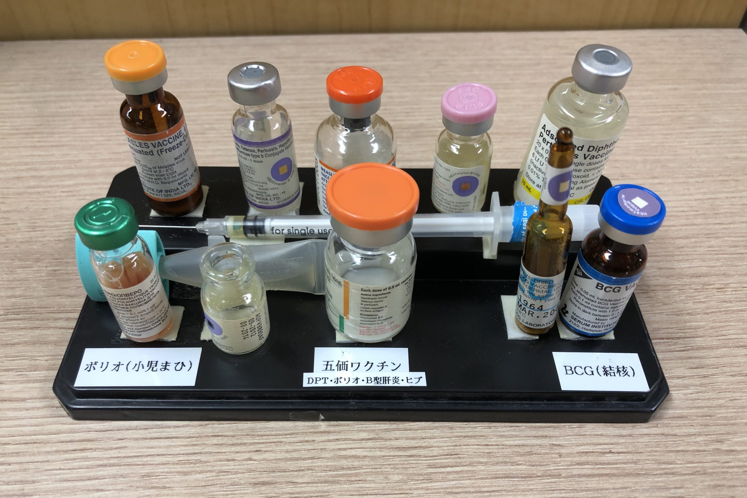 右:JCVが各国に送るワクチン。はしかのワクチンは左上段。
