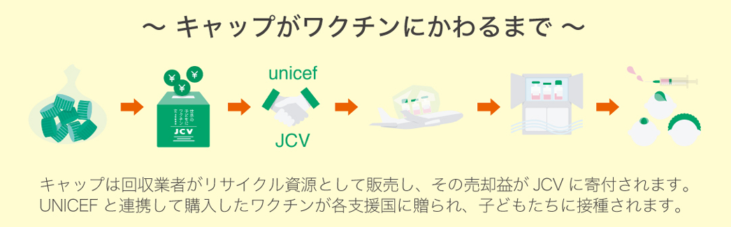 ペットボトルキャップを集めてリサイクルに回すと、その収益の一部がワクチン支援につながり、世界の子どもたちの命を守る力になる活動があります。