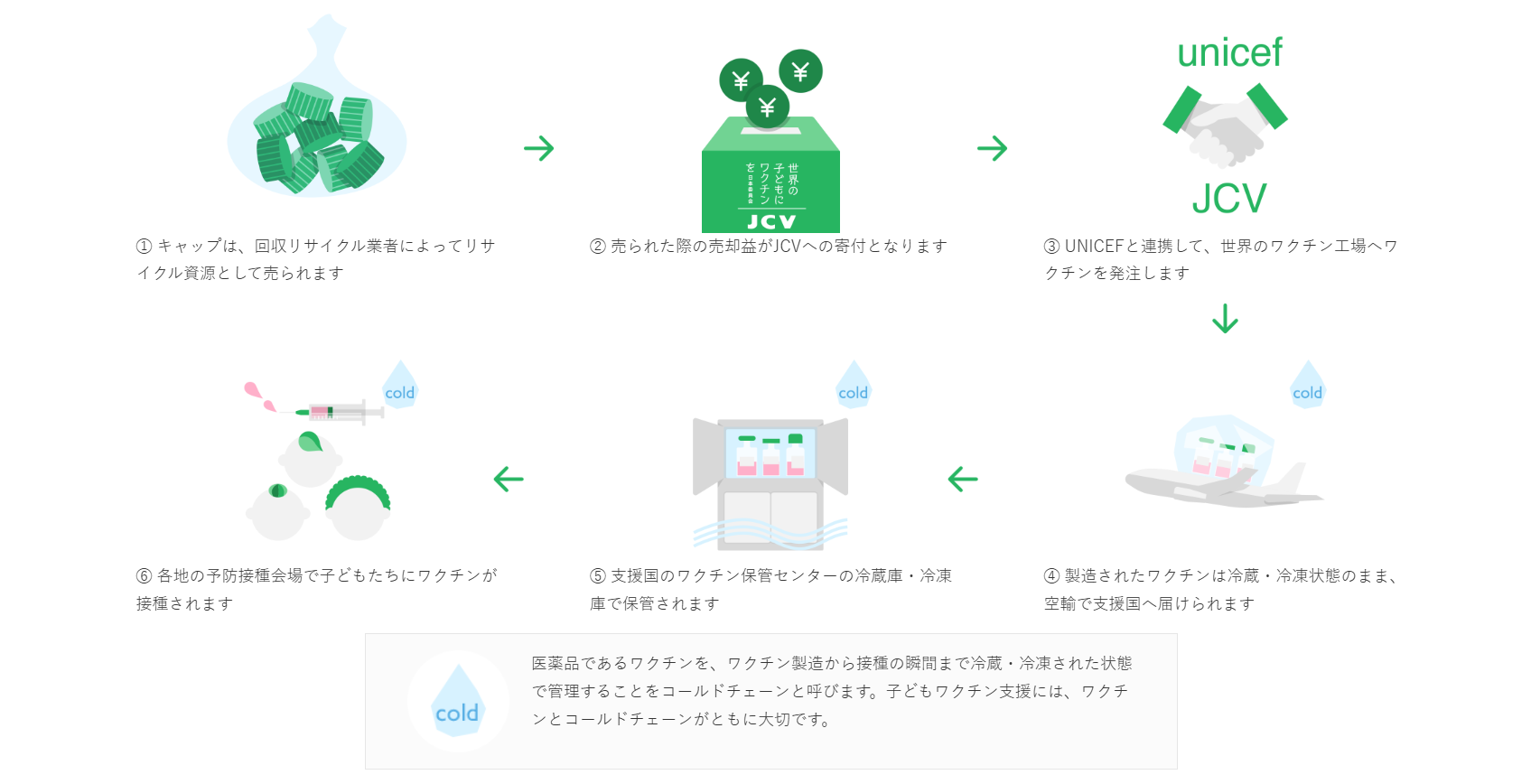 ペットボトルキャップ回収による子どもワクチン支援の仕組みは、以下の通りです。