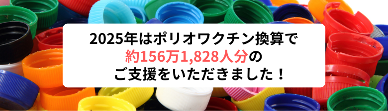 2025年は、ポリオワクチンに換算して約156万人1,828人分のご支援がペットボトルキャップの回収で集まりました(31,236,542円)。全国の皆さまが力を合わせてキャップを集めてくださったおかげです。ご支援ありがとうございます。