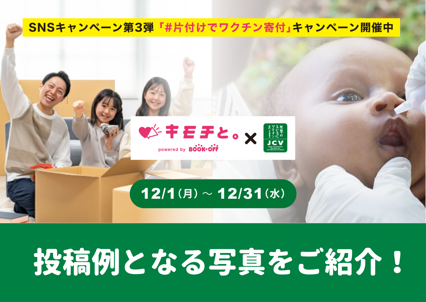 お片付けに関する写真や動画に指定のタグを付けてInstagramに投稿すると、1投稿で1人分の子どもワクチン支援に参加できる「#片付けでワクチン寄付」キャンペーンを開催中です。さらに、不要品の無料回収に申し込んでいただくことでも、支援につながります。皆さま、ぜひご参加ください。