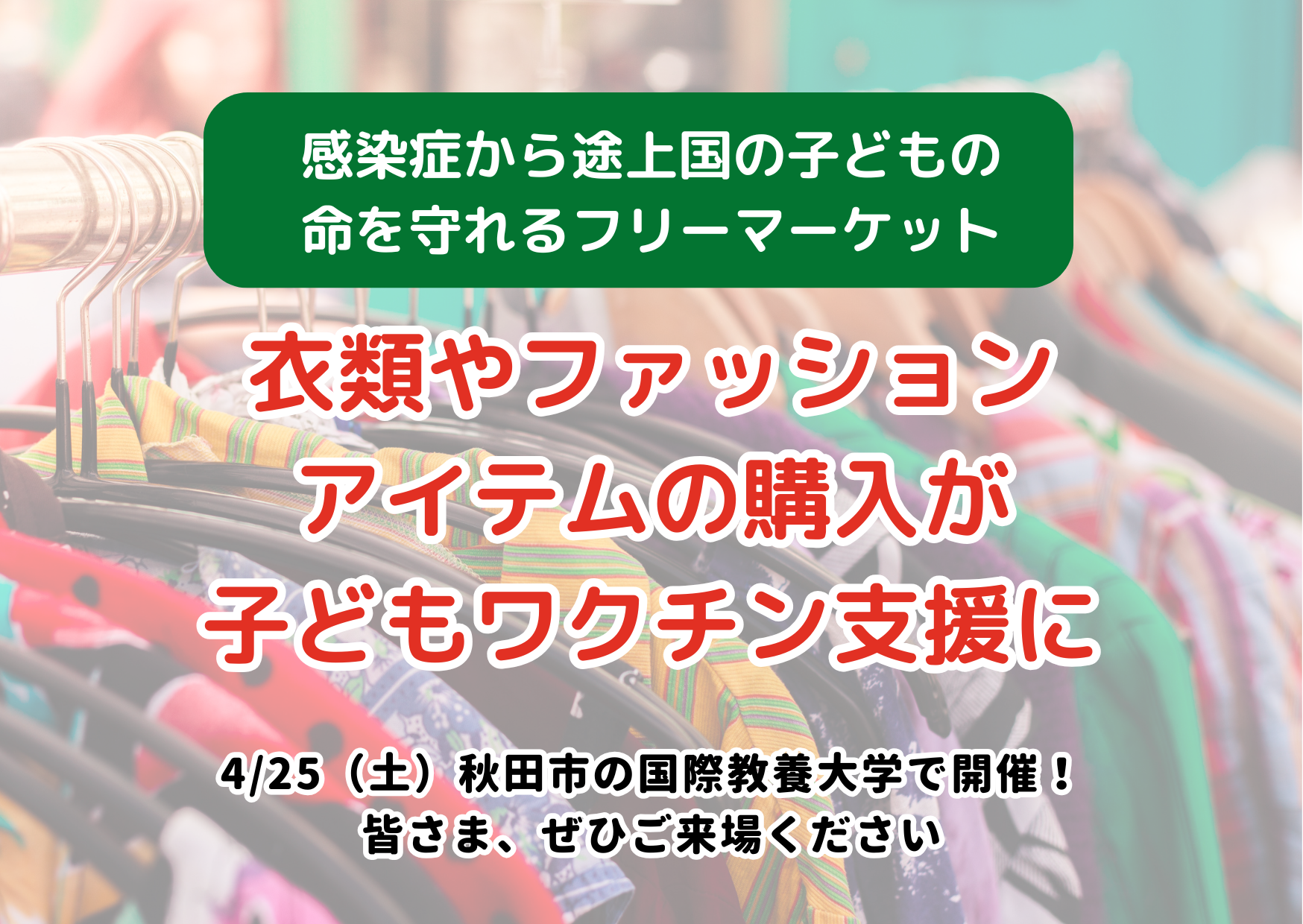 今日は、途上国の子どもの命を守れるチャリティイベントについてのお知らせです。秋田市の国際教養大学で「ファッションサークル JUSTLOVE」さまを中心としたチャリティフリーマーケットが開催されます。