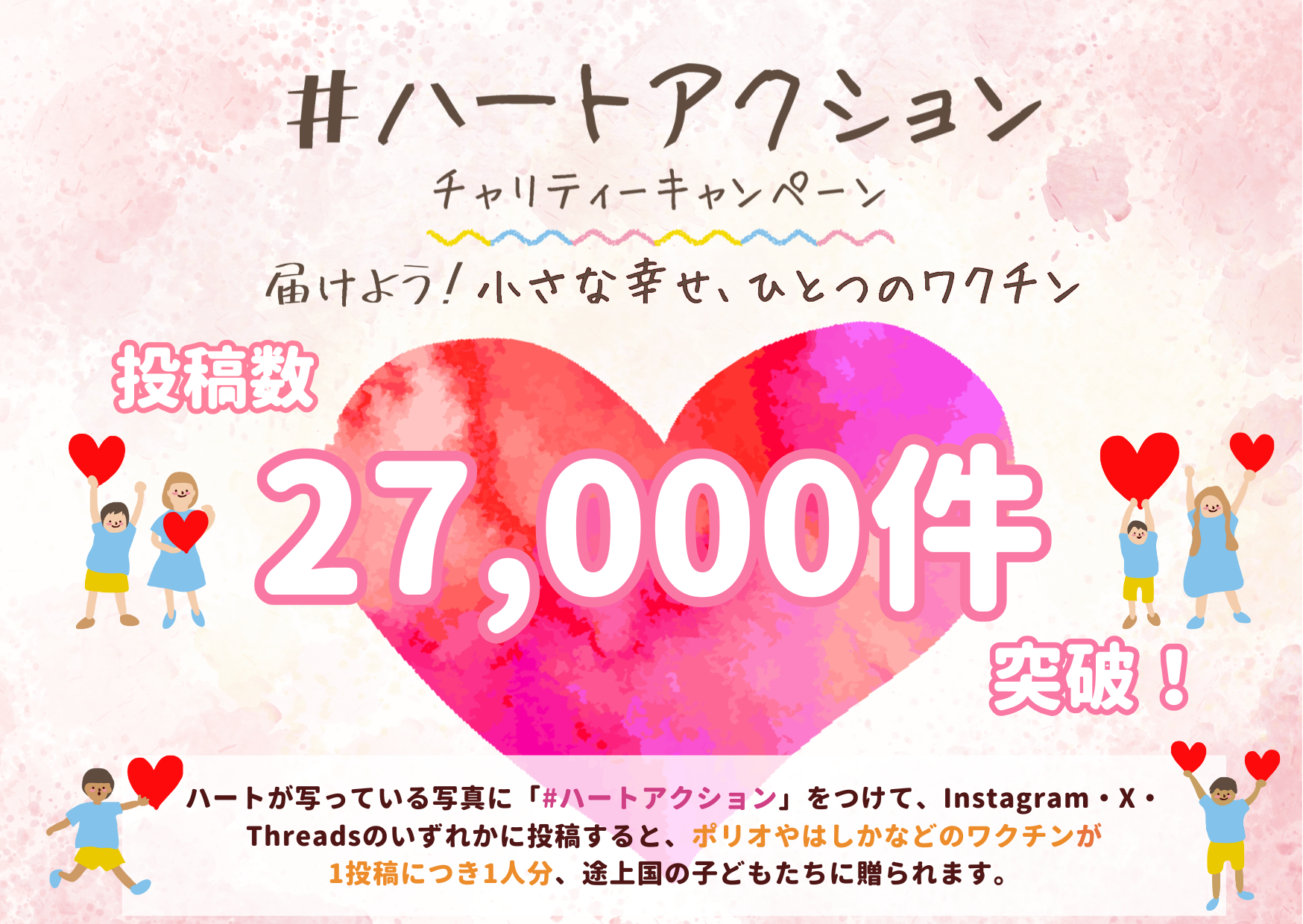 ハートの写真や動画をSNSに投稿すると、1投稿で1人分のワクチンが途上国の子ども達に贈られます。現在、ご協賛企業・団体を募集中です。
