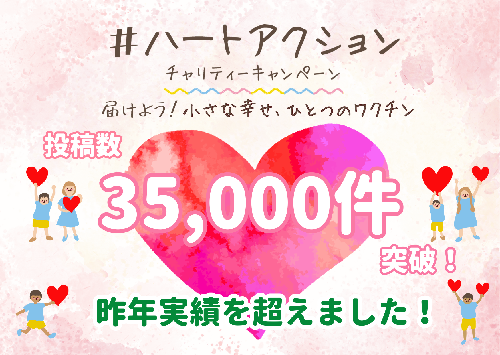 ポリオや破傷風などの感染症から、途上国の子ども達を守る「#ハートアクション」チャリティーキャンペーン。終了直前となりましたが、これまでの投稿数は35,000件を突破しました(2025/10/8 9:00時点)。過去最高となった昨年の32,623件を大きく超えてきています。