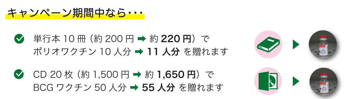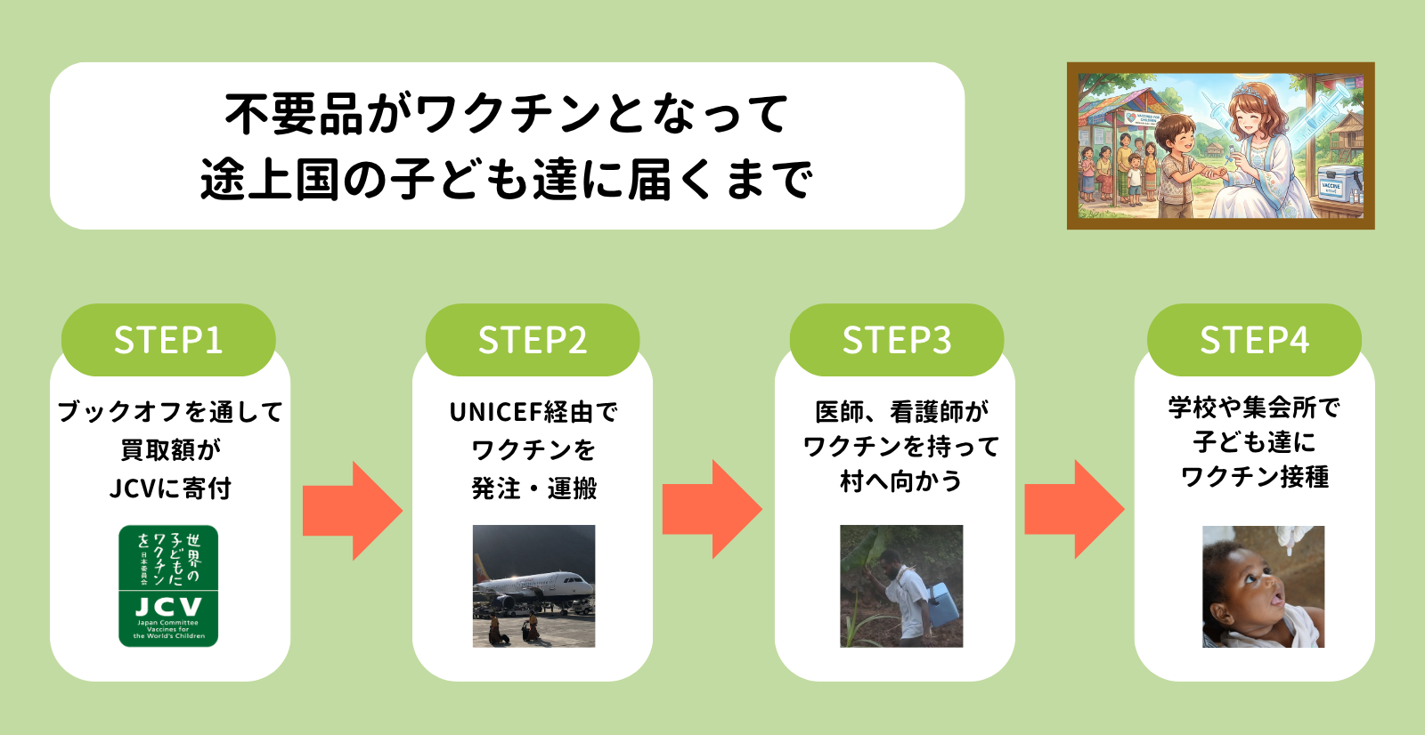 〇内容:ブックオフで買取可能な物品の無料回収にお申し込みいただくと、その買取額で途上国の子ども達にポリオや破傷風などのワクチンを支援できます。個人だけでなく、SDGsを推進する企業や団体さまもご参加いただけます。