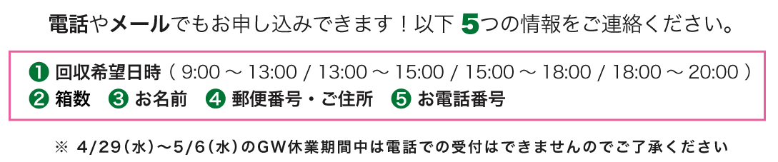 キャンペーンのご参加は、お電話やメールでお申し込みいただくこともできます。以下に記載の電話番号、メールアドレスまで、参加をご希望の旨と回収希望日時など5つの必要事項をご連絡ください。