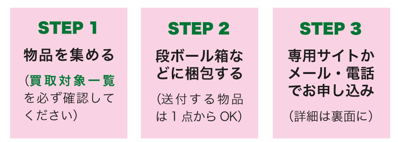 参加方法はとても簡単。買取対象の物品を集めたら、段ボール箱などに梱包して専用サイトから申し込みをするだけです。指定の日時に、ご家庭やオフィスまで宅配業者が無料回収にお伺いします。