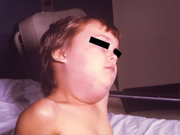 左:おたふく風邪を発症し、耳の下から顎にかけてが腫れ上がった子ども